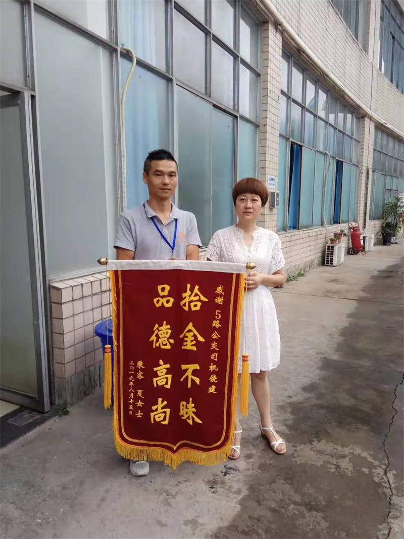 8月20日上午,市民夏女士冒著小雨來到公交總站,親手將一面寫有“拾金不昧品德高尚”的錦旗送到5路公交車司機(jī)饒建手上。送上錦旗時(shí),夏女士口中還在不停的念叨著:“公交司機(jī)師傅很棒,真的要感謝你喲!