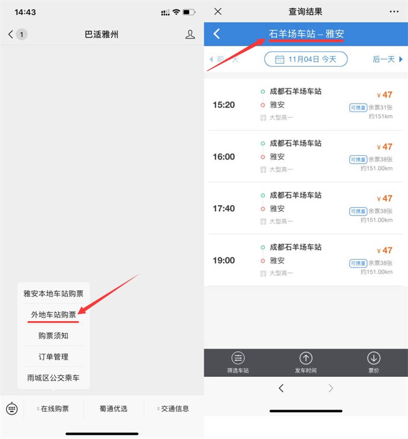 11月4日,蜀通公司線上購票平臺(tái)“巴適雅州”微信公眾號開通省內(nèi)外多地區(qū)汽車購票業(yè)務(wù)。