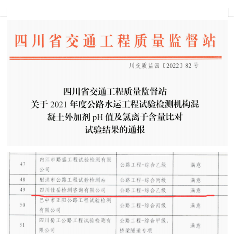 5月11日,四川省交通工程質(zhì)量監(jiān)督站印發(fā)《關(guān)于2021年度公路水運工程試驗檢測機(jī)構(gòu)混凝土外加劑PH值及氯離子含量比對試驗結(jié)果的通報,交建集團(tuán)四川佳岳檢測咨詢有限公司獲得“滿意”評價。