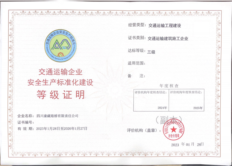 近日,經(jīng)四川省交通運輸企業(yè)安全生產(chǎn)標準化評價機構綜合評定,雅安交建集團四川康藏路橋有限責任公司順利通過安全標準化三級評價驗收并獲得“安全生產(chǎn)標準化三級企業(yè)”等級證明證書。