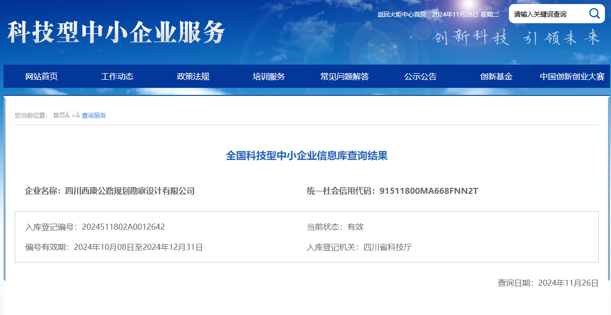 近日,四川省科學技術(shù)廳公布了本年度第五批入庫科技型中小企業(yè)名單,雅安交建集團四川西康公路規(guī)劃勘察設(shè)計有限公司榮獲“國家級科技型中小企業(yè)”稱號,標志著公司在科技創(chuàng)新道路上邁向了新的高度。