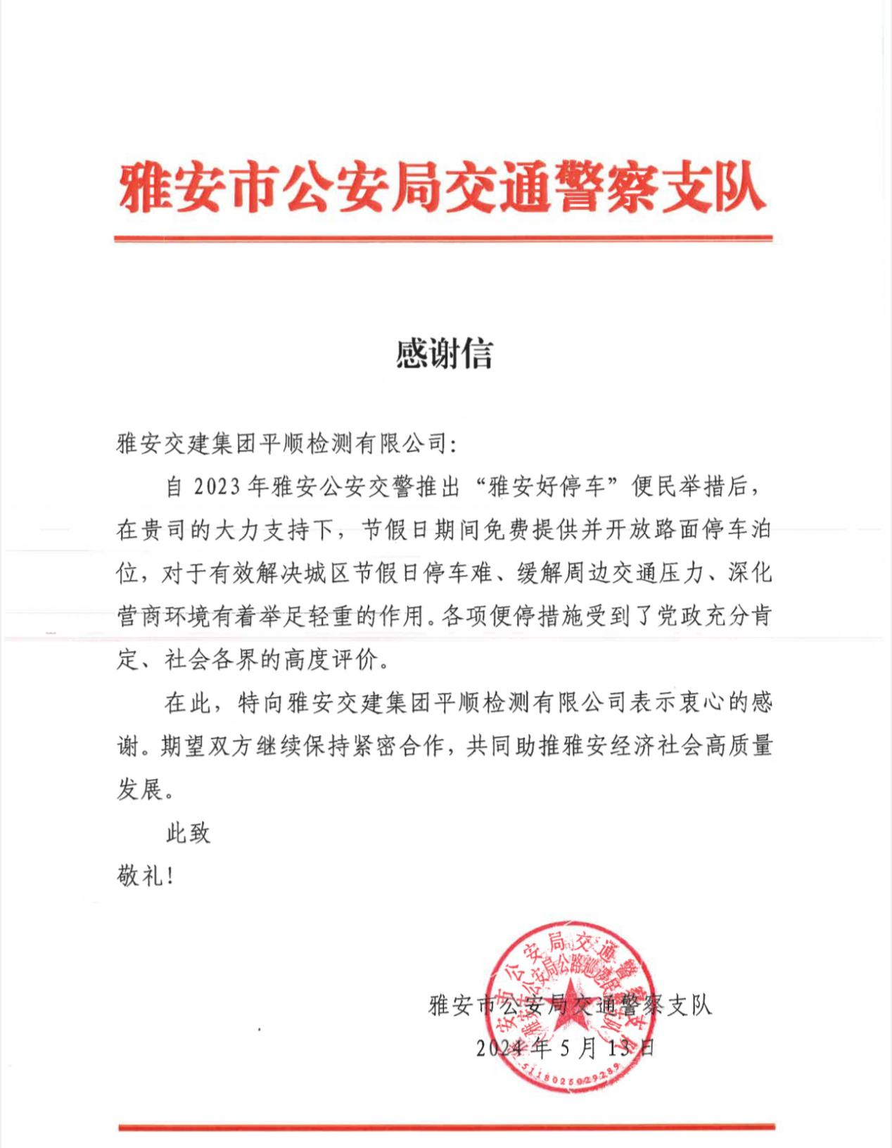 近日,雅安交建集團平順公司收到一封來自雅安市公安局交通警察支隊的感謝信,對平順公司積極響應(yīng)雅安公安交警“雅安好停車”便民措施,在節(jié)假日期間免費提供并開放路面停車泊位表示感謝。