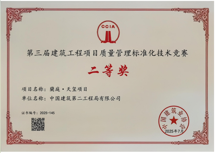 近日,交建開發(fā)公司旗下“蘭庭・天璽”項目在中國建筑業(yè)協(xié)會組織的“第三屆建筑工程項目質(zhì)量管理標(biāo)準(zhǔn)化技術(shù)競賽”中榮獲二等獎。此次獲獎,標(biāo)志著“蘭庭・天璽”項目的質(zhì)量管理體系與工程實體質(zhì)量獲得了行業(yè)權(quán)威認可,為項目后續(xù)創(chuàng)建更高層次的品質(zhì)獎項積累了寶貴經(jīng)驗。