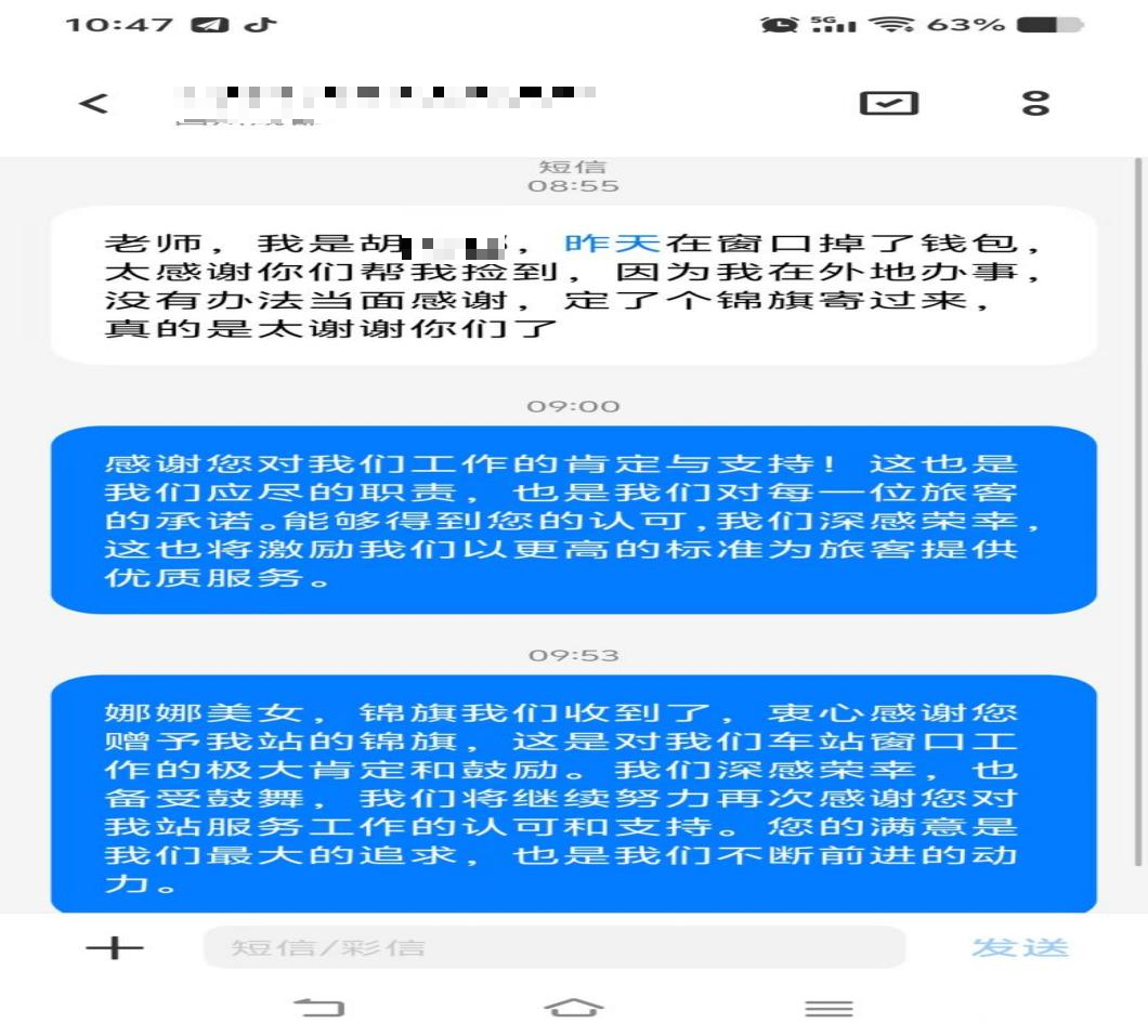 5月14日11時11分,售票員郝凌云發(fā)現(xiàn)柜臺上遺留了一個卡包,內(nèi)有現(xiàn)金 300 元、多張銀行卡、身份證及社?ǖ戎匾锲。郝凌云第一時間上報值班科長,通過站務(wù)系統(tǒng)比對購票信息,僅用5分鐘便鎖定失主為即將前往漢源的旅客胡女士,此時胡女士正在等待檢票,尚未察覺錢包丟失。值班站長通過廣播系統(tǒng)緊急尋人,胡女士聽到廣播后立即前往值班室認(rèn)領(lǐng)物品,經(jīng)值班科長仔細(xì)核對身份及物品信息后,將卡包完好歸還。胡女士激動致謝:“太感謝你了!你們汽車站的工作人員素質(zhì)真高,太讓人暖心了!”