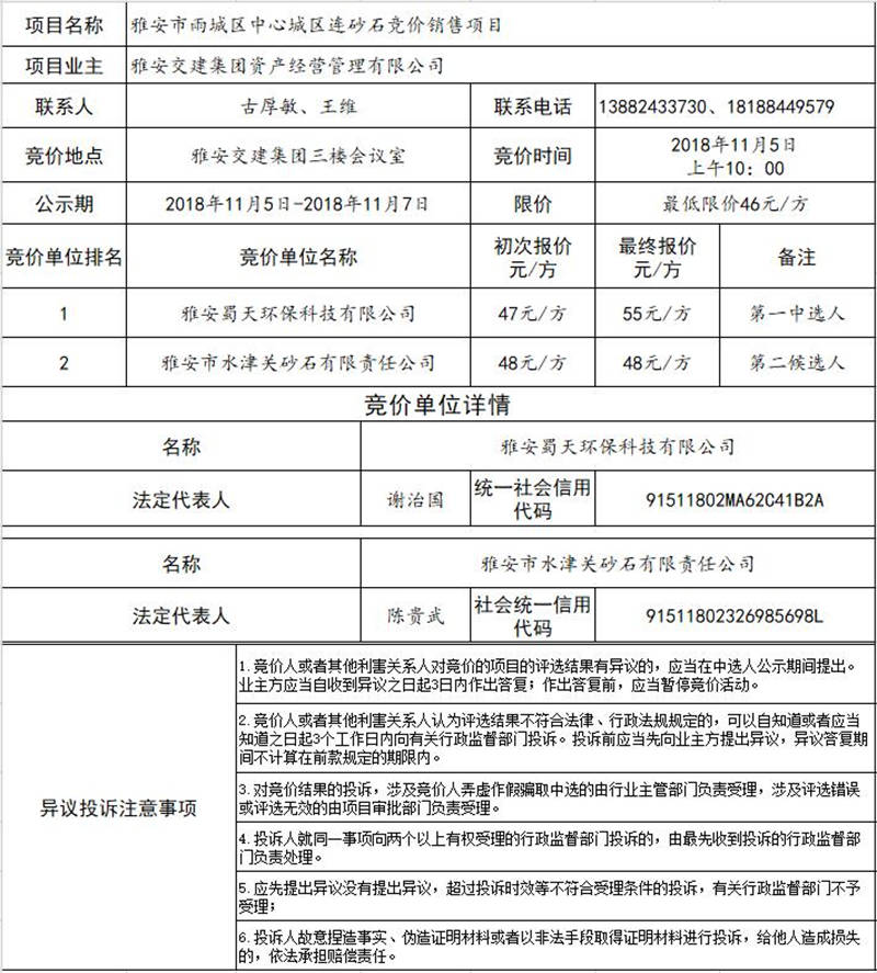 雅安交建集團(tuán)資產(chǎn)經(jīng)營管理有限公司關(guān)于雅安市雨城區(qū)中心城區(qū)連砂石競價銷售結(jié)果公示