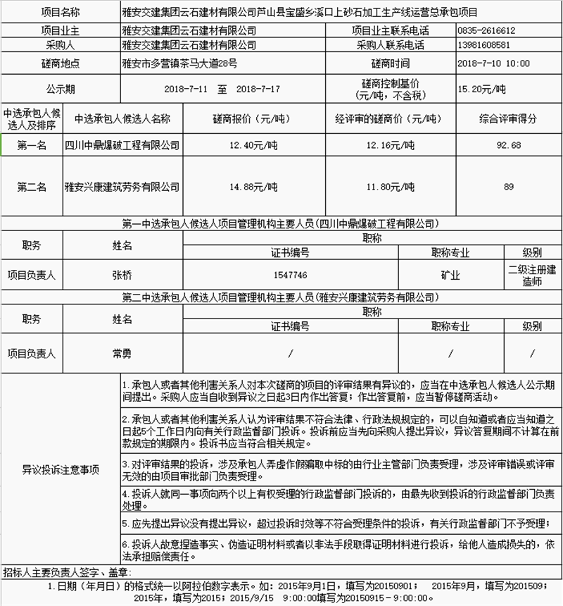 雅安交建集團(tuán)云石建材有限公司蘆山縣寶盛鄉(xiāng)溪口上砂石加工生產(chǎn)線運(yùn)營總承包項(xiàng)目中選承包人公示