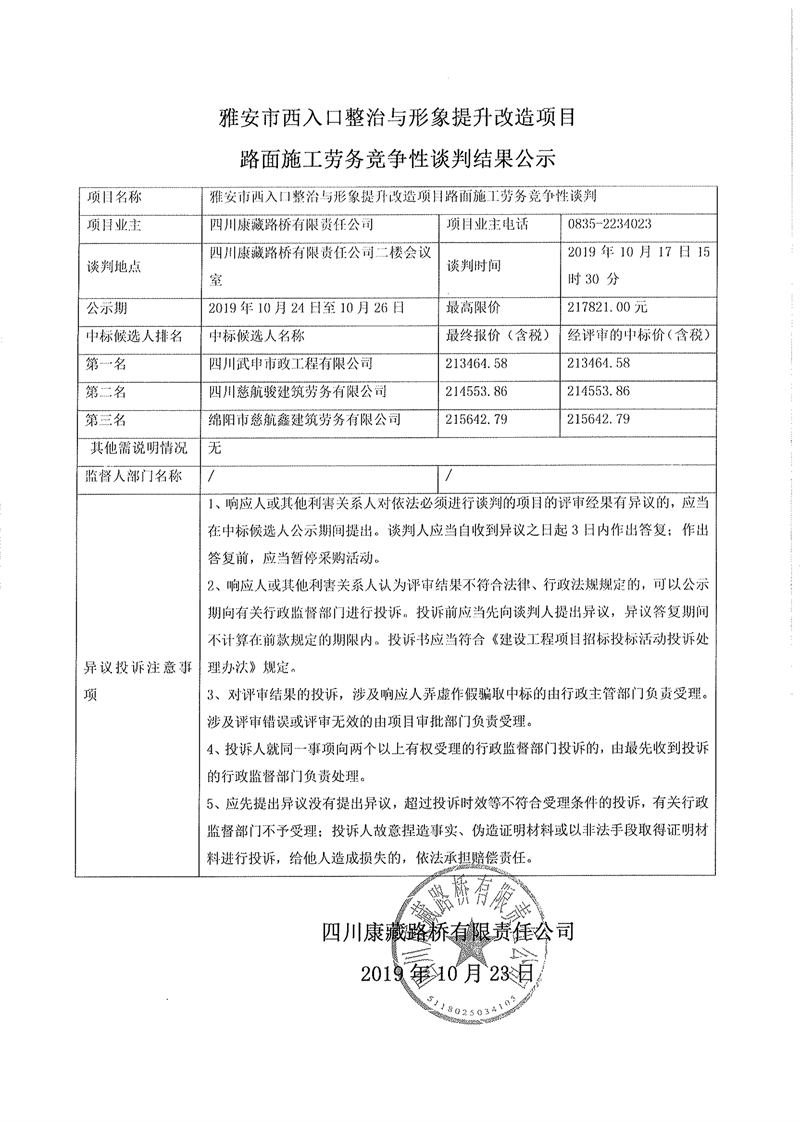 四川康藏路橋有限責(zé)任公司雅安市西入口整治與形象提升改造項(xiàng)目路面施工勞務(wù)競(jìng)爭(zhēng)性談判結(jié)果公示