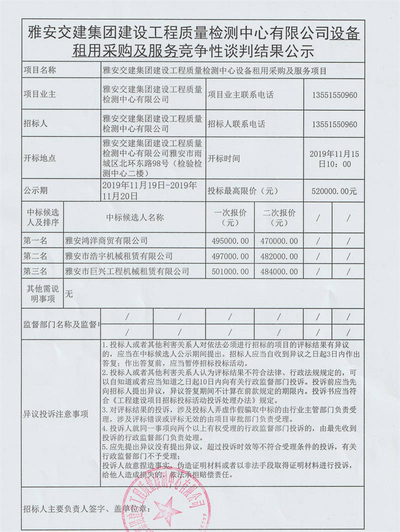 雅安交建集團(tuán)建設(shè)工程質(zhì)量檢測(cè)中心有限公司設(shè)備租用采購及服務(wù)競(jìng)爭(zhēng)性談判結(jié)果公示