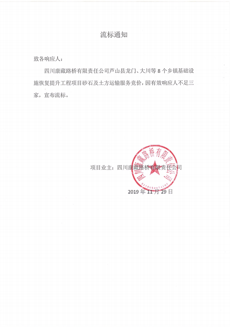 四川康藏路橋有限責(zé)任公司蘆山縣龍門、大川等8個鄉(xiāng)鎮(zhèn)基礎(chǔ)設(shè)施恢復(fù)提升工程項(xiàng)目砂石及土方運(yùn)輸服務(wù)競價流標(biāo)通知