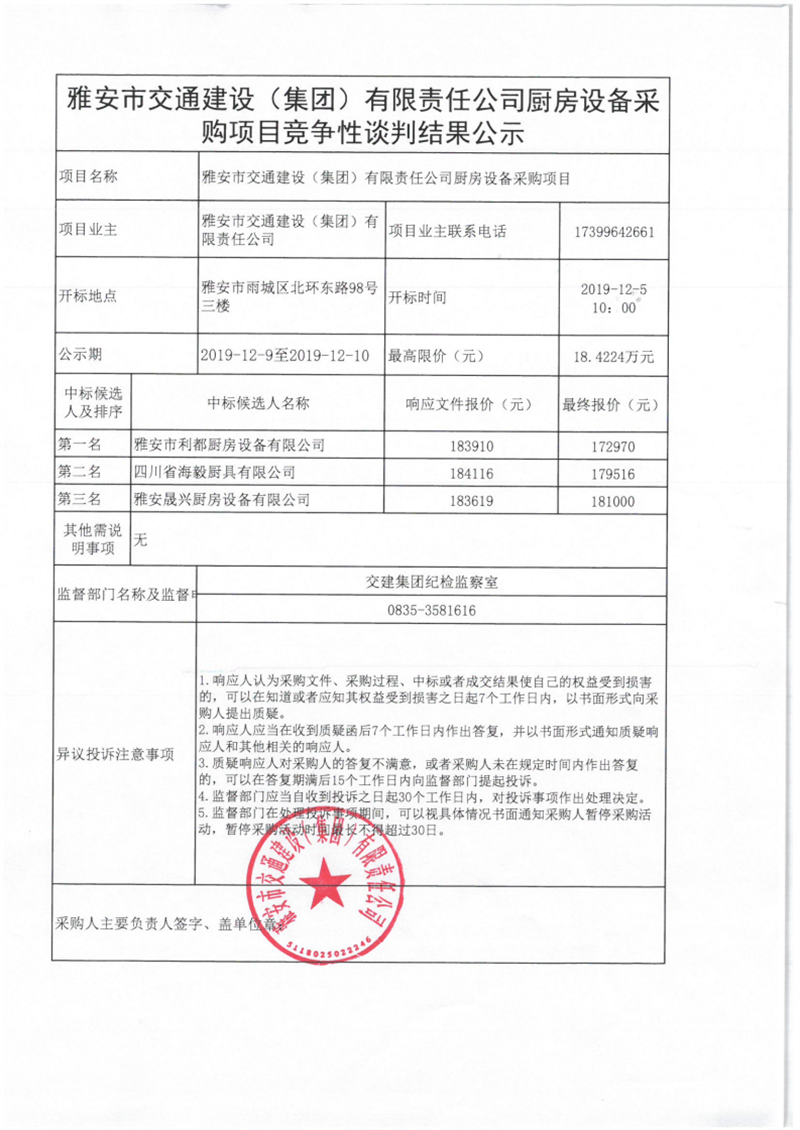 雅安市交通建設(shè)(集團(tuán))有限責(zé)任公司廚房設(shè)備采購(gòu)項(xiàng)目競(jìng)爭(zhēng)性談判結(jié)果公示