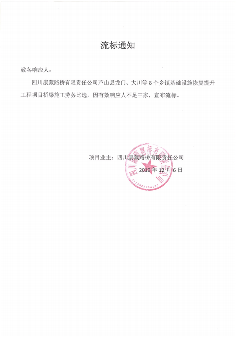 四川康藏路橋有限責任公司蘆山縣龍門、大川等8個鄉(xiāng)鎮(zhèn)基礎設施恢復提升工程項目橋梁施工勞務比選流標通知