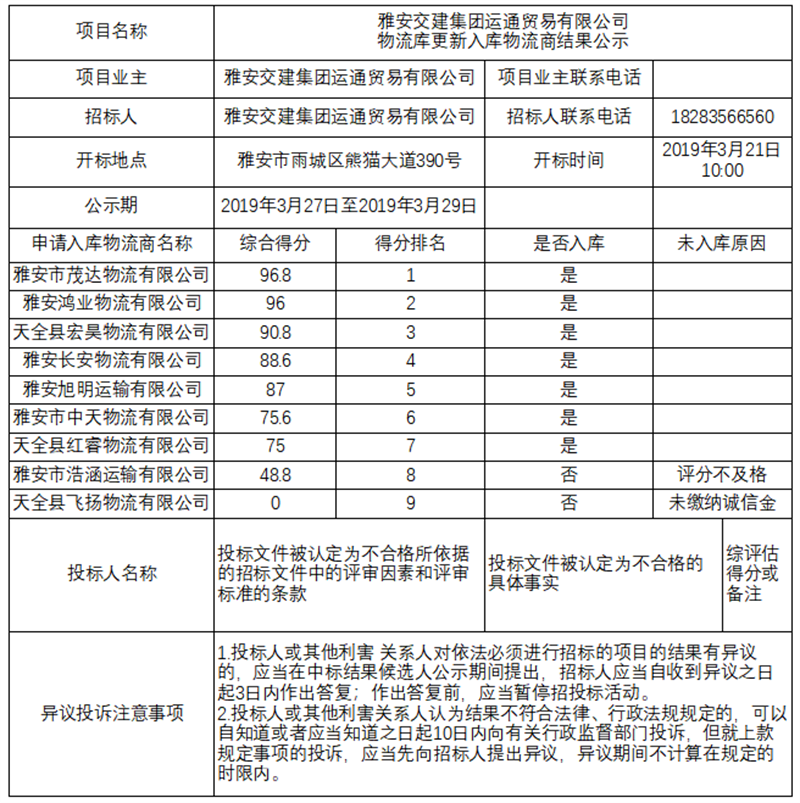 雅安交建集團(tuán)運(yùn)通貿(mào)易有限公司物流庫(kù)更新入庫(kù)物流商結(jié)果公示