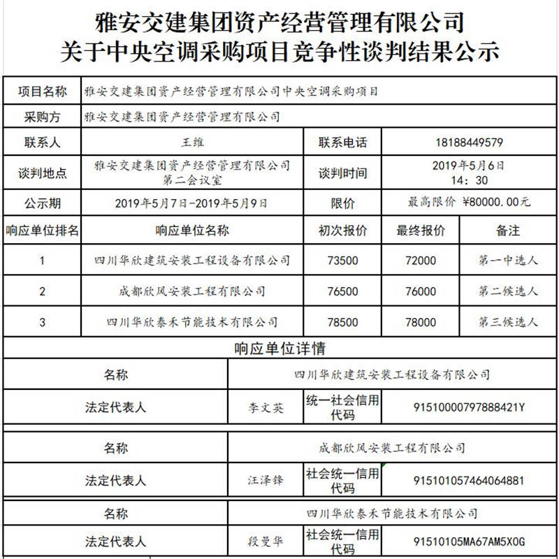 雅安交建集團資產(chǎn)經(jīng)營管理有限公司 關于中央空調(diào)采購項目競爭性談判結果公示