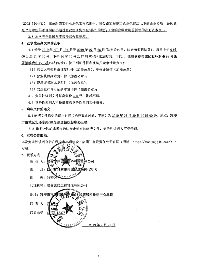 雅安交建集團路橋有限責任公司國道351線磽磧至夾金山段路面改造工程交通安全設施施工項目競爭性談判公告