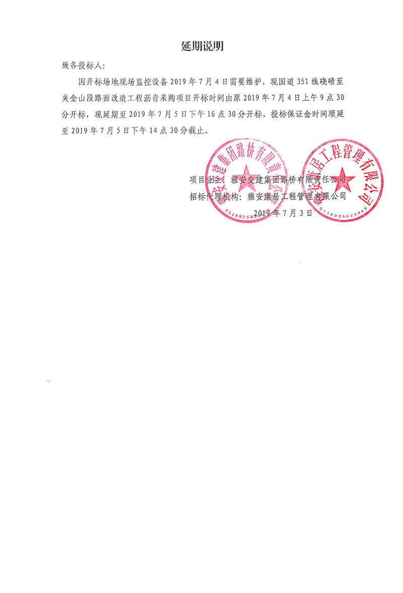 雅安交建集團(tuán)路橋有限責(zé)任公司國(guó)道351線磽磧至夾金山段路面改造工程瀝青采購(gòu)招標(biāo)延期說(shuō)明