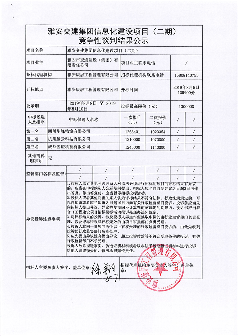 雅安交建集團信息化建設項目(二期)競爭性談判結果公示