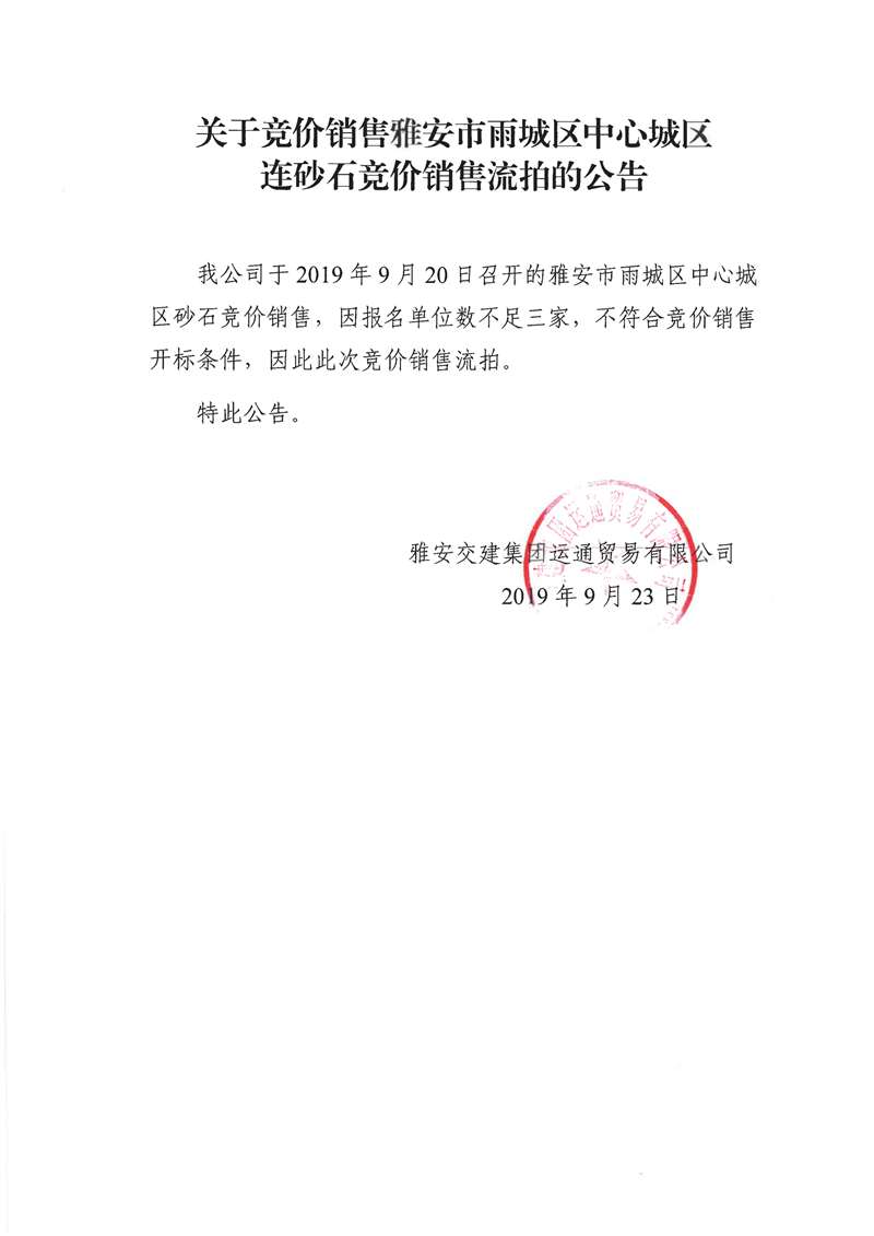 雅安交建集團運通貿(mào)易有限公司關于競價銷售雅安市雨城區(qū)中心城區(qū)連砂石競價銷售流拍的公告