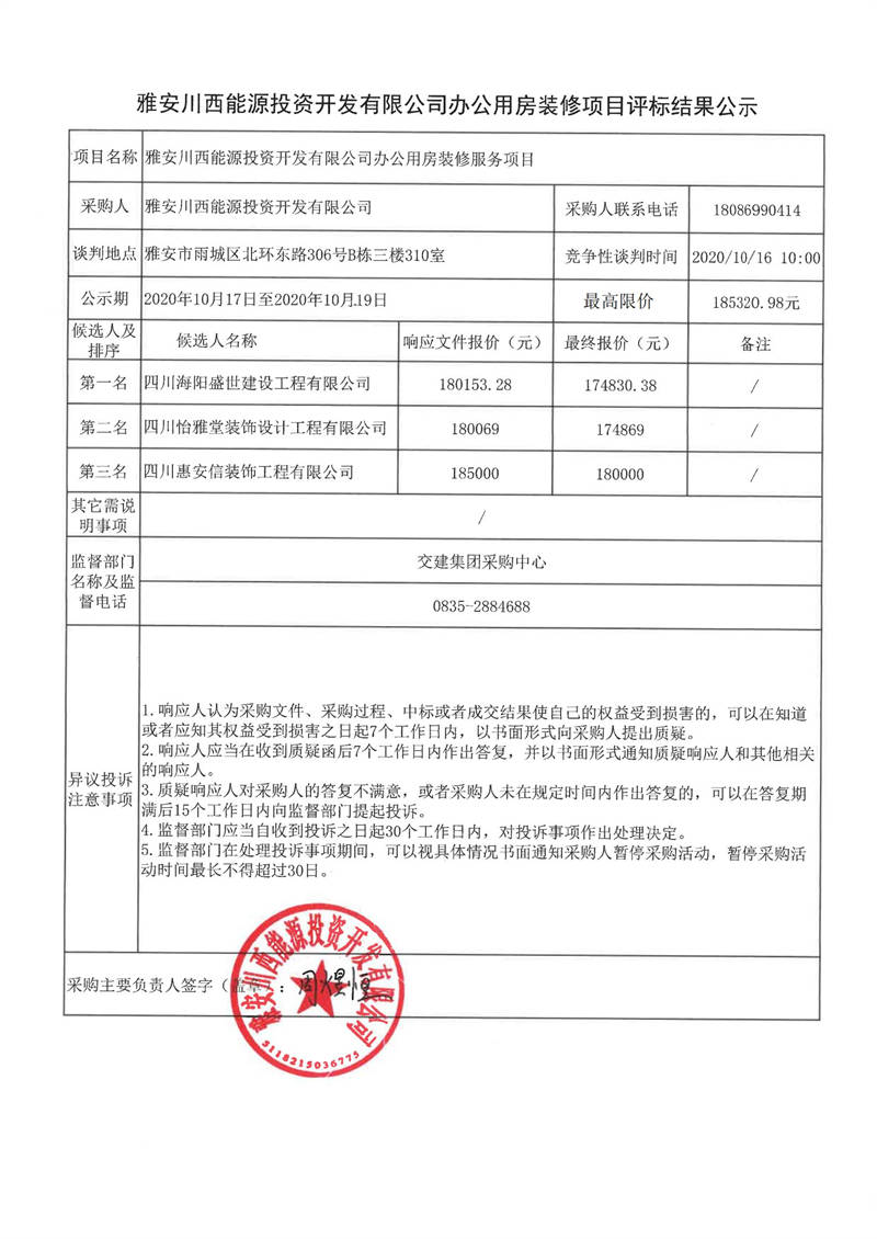 雅安川西能源投資開發(fā)有限公司辦公用房裝修項(xiàng)目評(píng)標(biāo)結(jié)果公示