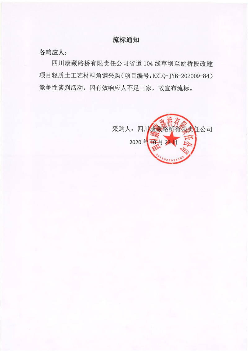 四川康藏路橋有限責(zé)任公司省道104線草壩至姚橋段改建項目輕質(zhì)土工藝材角鋼采購項目流標通知