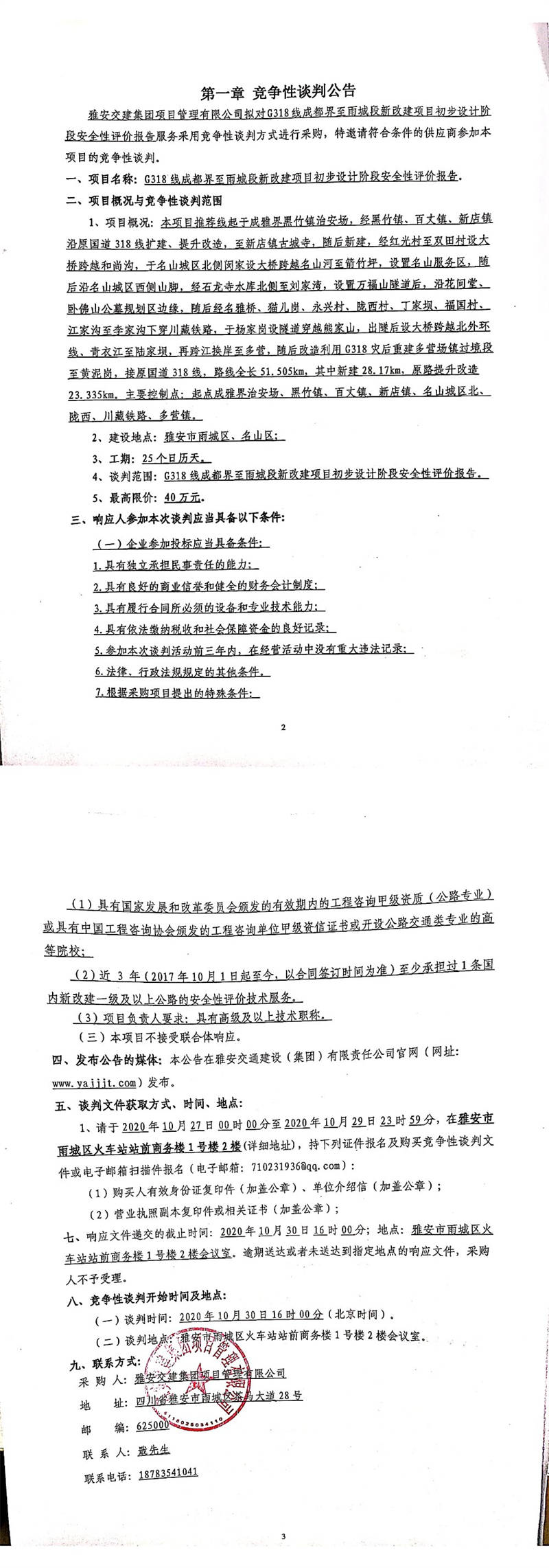 雅安交建集團(tuán)項(xiàng)目管理有限公司G318線(xiàn)成都界至雨城段新改建項(xiàng)目初步設(shè)計(jì)階段安全性評(píng)價(jià)報(bào)告競(jìng)爭(zhēng)性談判公告