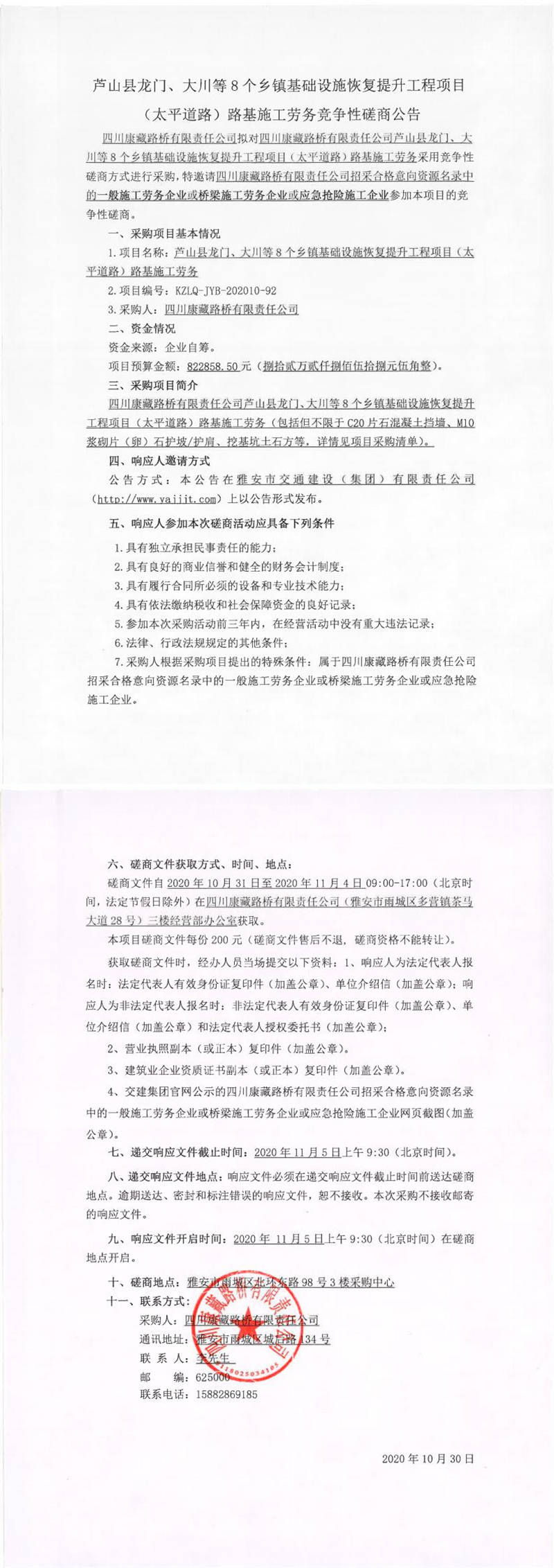 四川康藏路橋有限責(zé)任公司蘆山縣龍門、大川等8個(gè)鄉(xiāng)鎮(zhèn)基礎(chǔ)設(shè)施恢復(fù)提升工程項(xiàng)目(太平道路)路基施工勞務(wù)競(jìng)爭(zhēng)性磋商公告