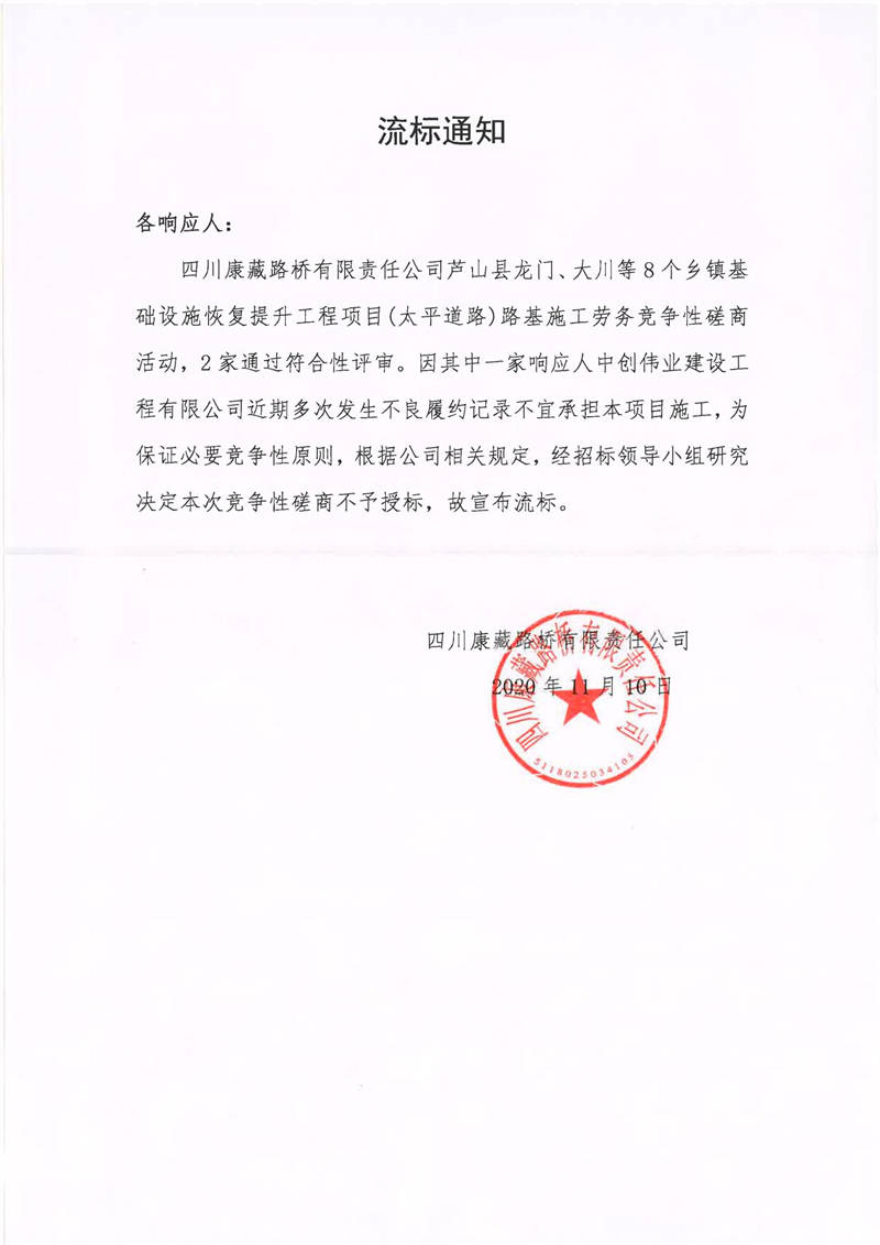 四川康藏路橋有限責(zé)任公司蘆山縣龍門、大川等8個鄉(xiāng)鎮(zhèn)基礎(chǔ)設(shè)施恢復(fù)提升工程項目(太平道路)路基施工勞務(wù)流標(biāo)通知
