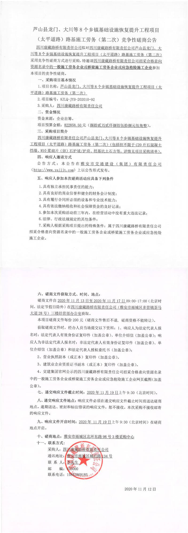 四川康藏路橋有限責(zé)任公司蘆山縣龍門、大川等8個(gè)鄉(xiāng)鎮(zhèn)基礎(chǔ)設(shè)施恢復(fù)提升工程項(xiàng)目(太平道路)路基施工勞務(wù)(第二次)競爭性磋商公告