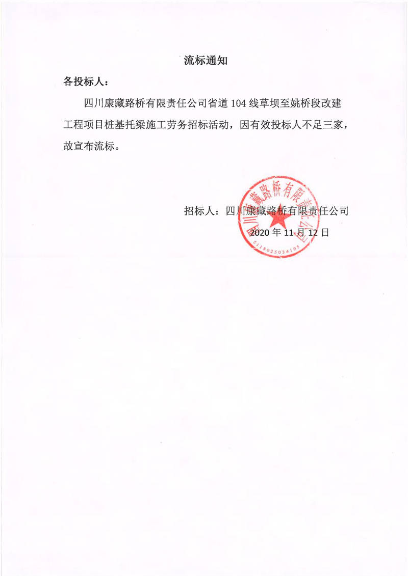 四川康藏路橋有限責任公司省道104線草壩至姚橋段改建工程項目樁基托梁施工勞務(wù)流標通知