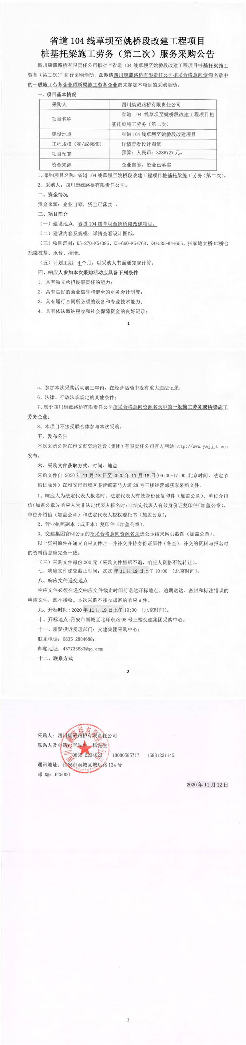 四川康藏路橋有限責(zé)任公司省道104線草壩至姚橋段改建工程項(xiàng)目樁基托梁施工勞務(wù)(第二次)服務(wù)采購公告
