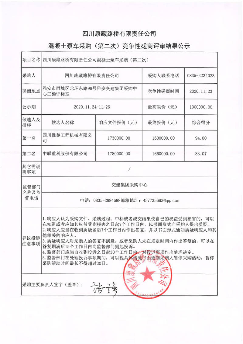 四川康藏路橋有限責(zé)任公司混凝土泵車采購(第二次)競(jìng)爭(zhēng)性磋商評(píng)審結(jié)果公示