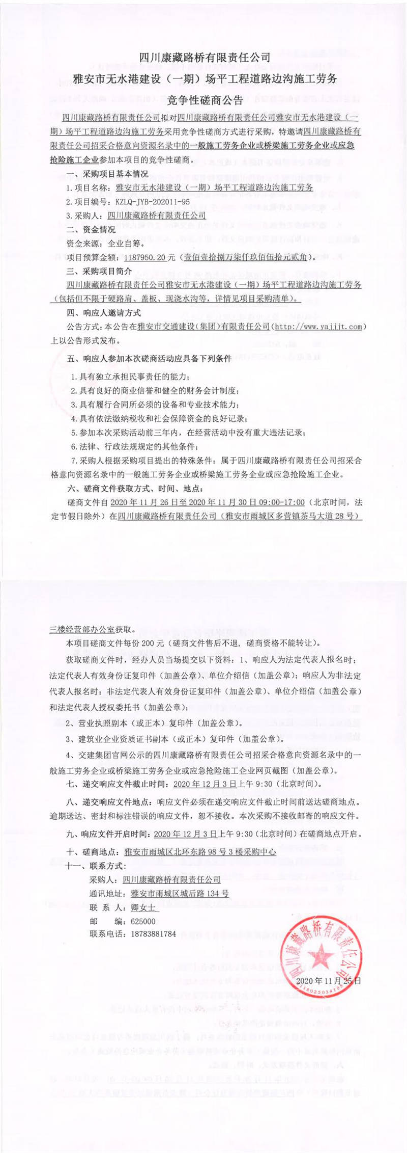 四川康藏路橋有限責(zé)任公司雅安市無水港建設(shè)(一期)場(chǎng)平工程道路邊溝施工勞務(wù)競(jìng)爭(zhēng)性磋商公告