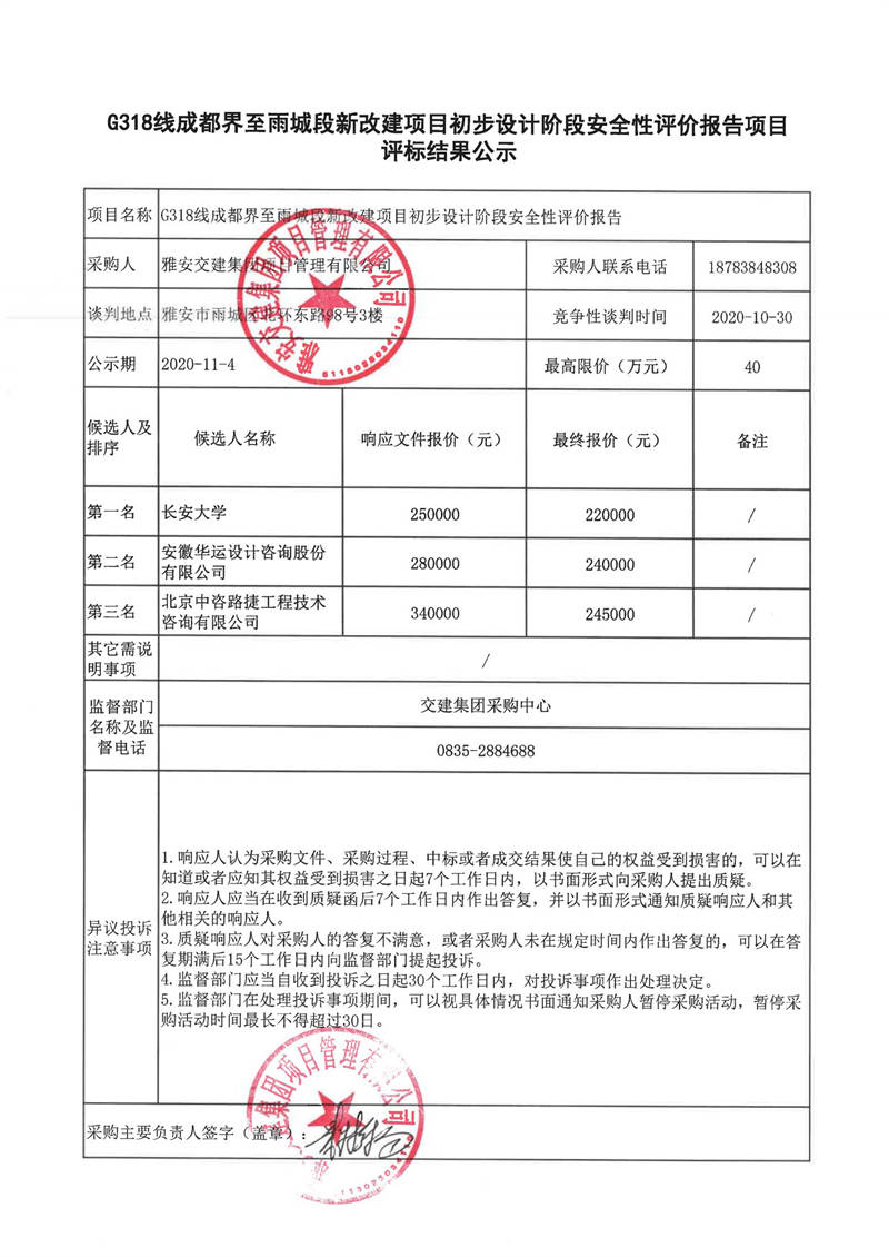 雅安交建集團(tuán)項(xiàng)目管理有限公司G318線成都界至雨城段新改建項(xiàng)目初步設(shè)計(jì)階段安全性評價報告項(xiàng)目評標(biāo)結(jié)果公示