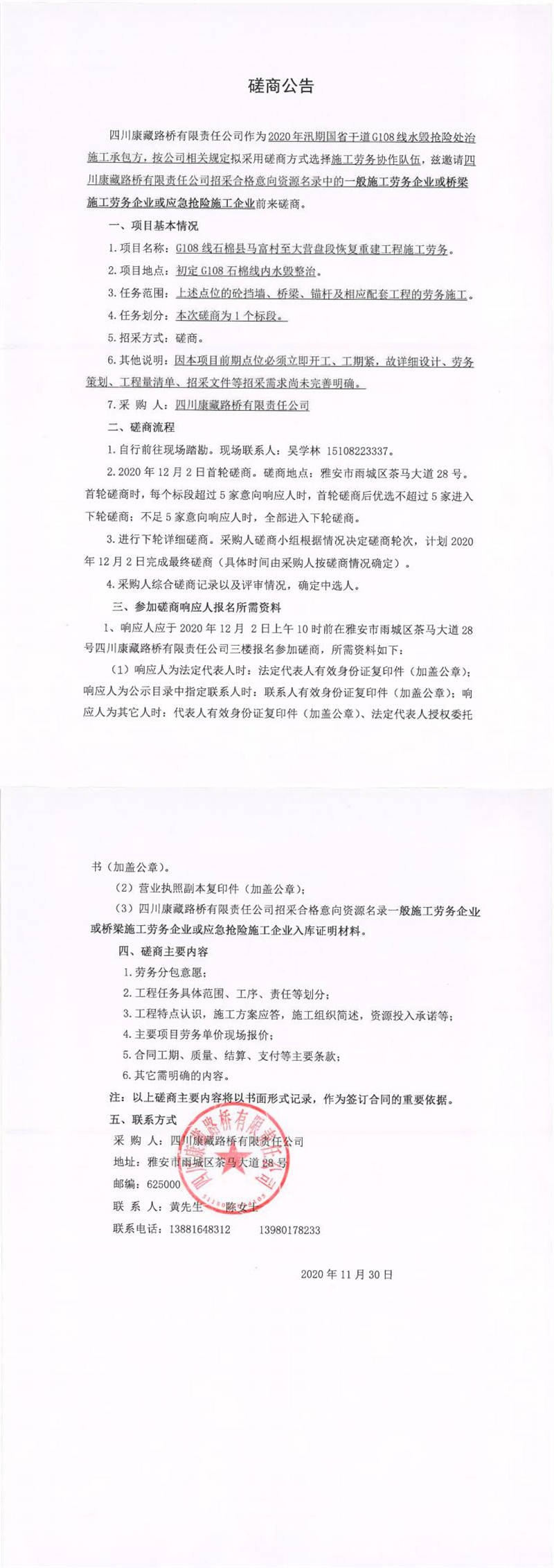 四川康藏路橋有限責(zé)任公司G108線石棉縣馬富村至大營(yíng)盤(pán)段恢復(fù)重建工程施工勞務(wù)磋商公告
