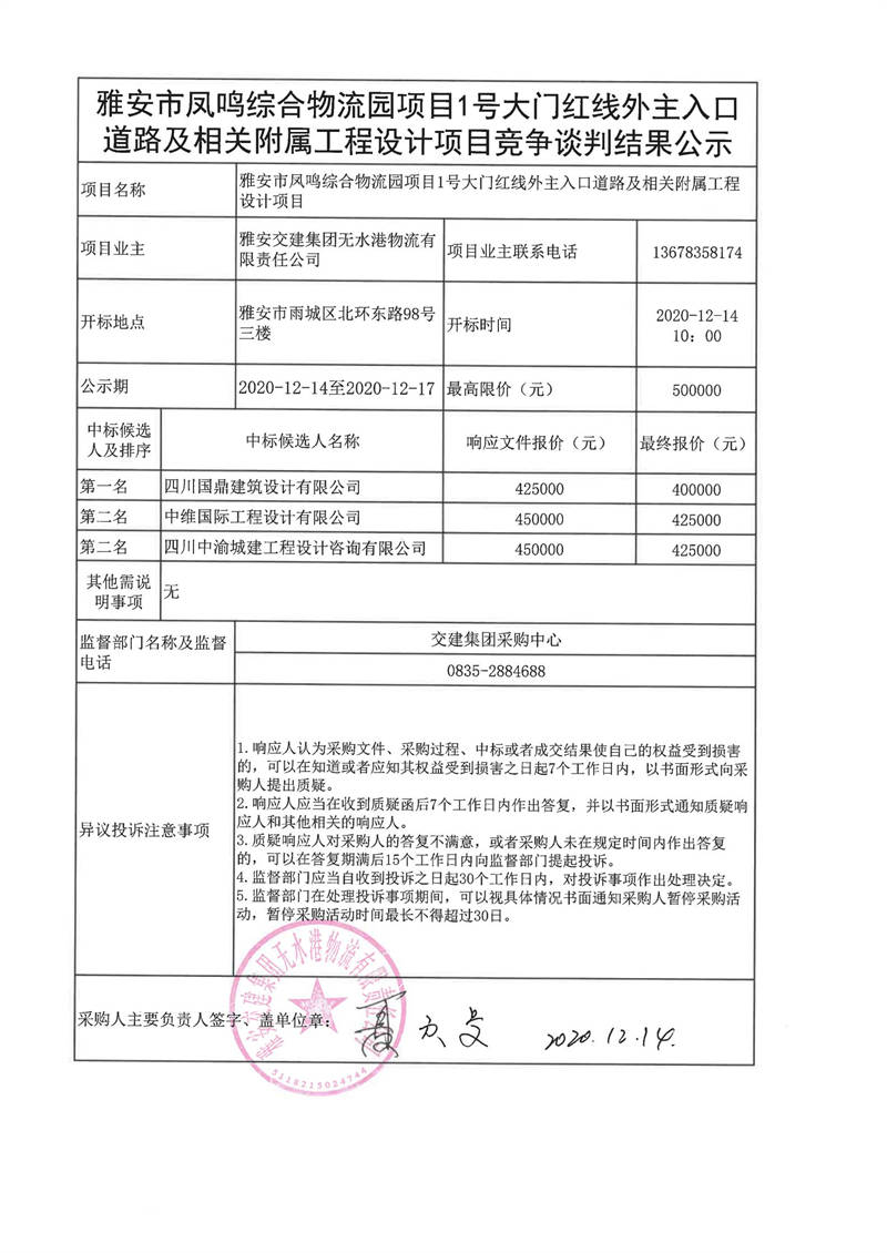 雅安交建集團無水港物流有限責任公司雅安市鳳鳴綜合物流園項目1號大門紅線外主入口道路及相關(guān)附屬工程設計項目談判結(jié)果公示