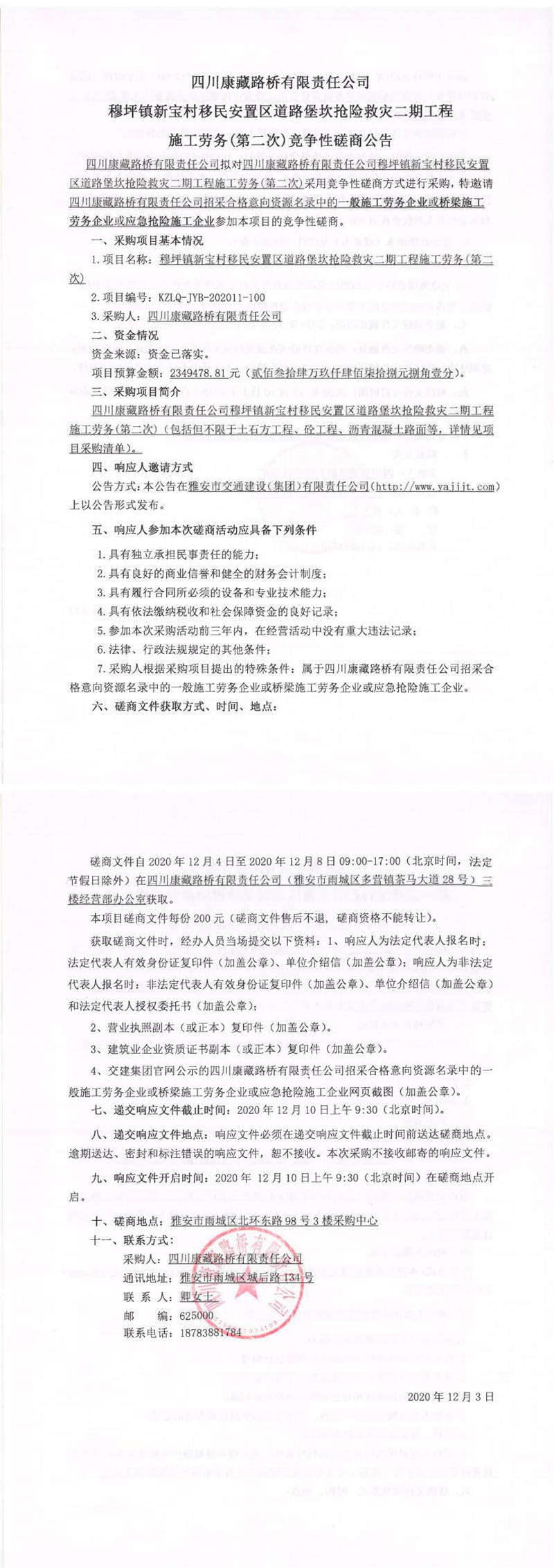 四川康藏路橋有限責任公司穆坪鎮(zhèn)新寶村移民安置區(qū)道路堡坎搶險救災(zāi)二期工程施工勞務(wù)(第二次)競爭性磋商公告