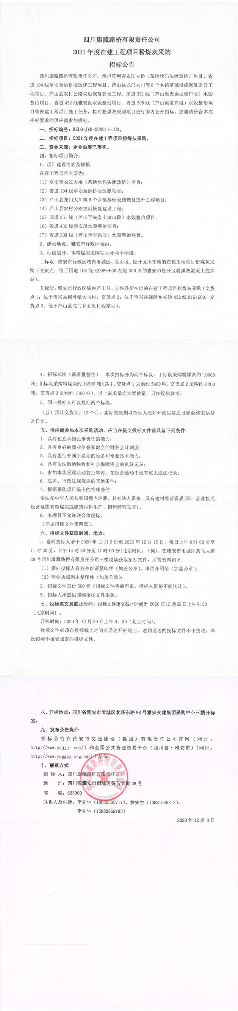 四川康藏路橋有限責(zé)任公司2021年度在建工程項(xiàng)目粉煤灰采購(gòu)招標(biāo)公告