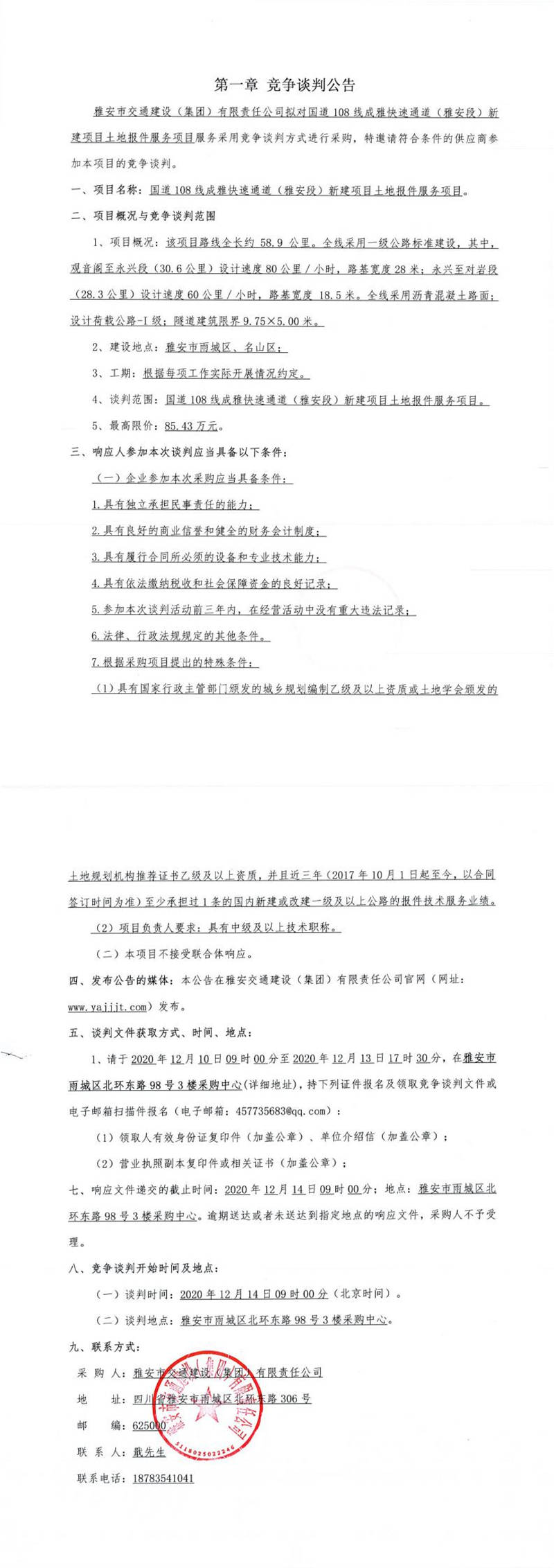 雅安市交通建設(shè)(集團)有限責(zé)任公司國道108線成雅快速通道(雅安段)新建項目土地報件服務(wù)項目競爭談判公告