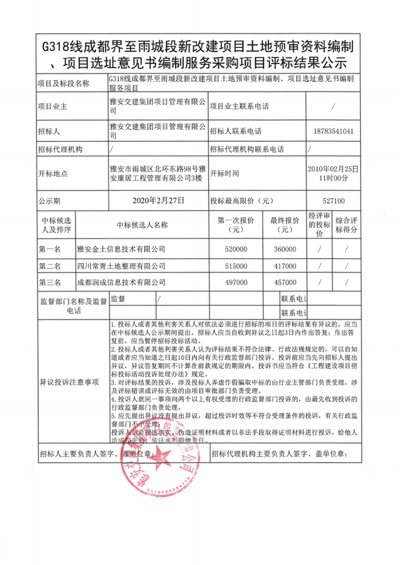 雅安交建集團項目管理有限公司G318線成都界至雨城段新改建項目土地預審資料編制、項目選址意見書編制服務采購項目評標結(jié)果公示