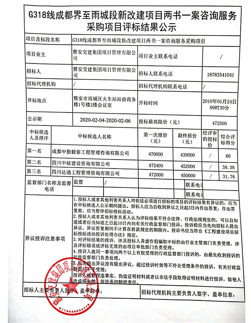 雅安交建集團項目管理有限公司G318線成都界至雨城段新改建項目勘測定界服務(wù)采購項目評標結(jié)果公示