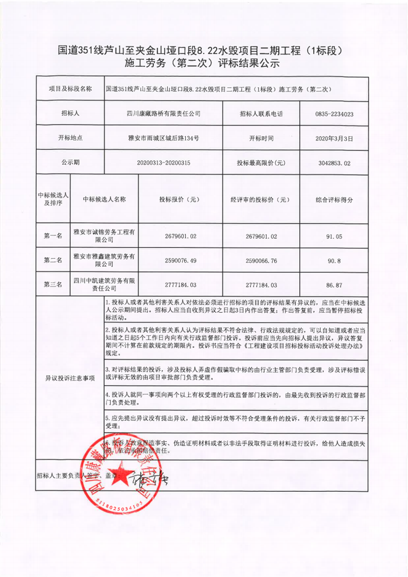 四川康藏路橋有限責(zé)任公司國(guó)道351線(xiàn)蘆山至夾金山埡口段8.22水毀項(xiàng)目二期工程(1標(biāo)段)施工勞務(wù)(第二次)評(píng)標(biāo)結(jié)果公示