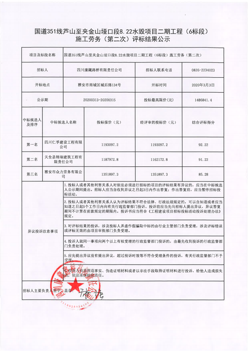 四川康藏路橋有限責(zé)任公司國道351線蘆山至夾金山埡口段8.22水毀項目二期工程(6標(biāo)段)施工勞務(wù)(第二次)評標(biāo)結(jié)果公示