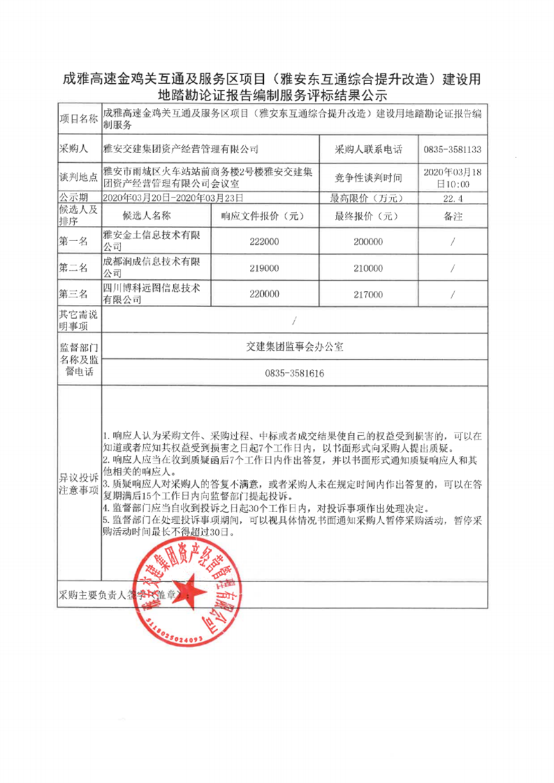 雅安交建集團資產(chǎn)經(jīng)營管理有限公司成雅高速金雞關互通及服務區(qū)項目(雅安東互通綜合提升改造)建設用地踏勘論證報告編制服務評標結(jié)果公示