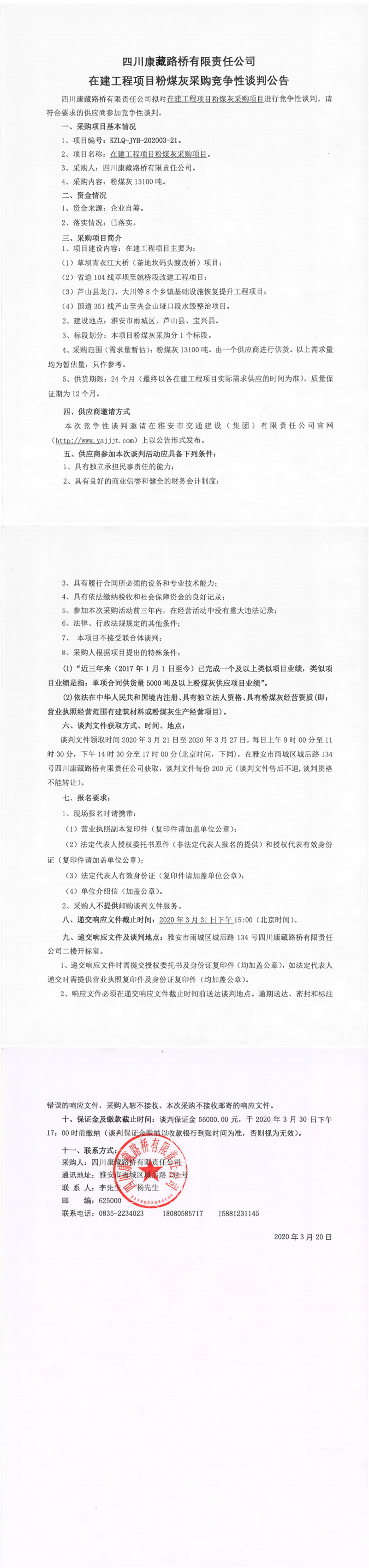 四川康藏路橋有限責(zé)任公司在建工程項(xiàng)目粉煤灰采購(gòu)競(jìng)爭(zhēng)性談判公告