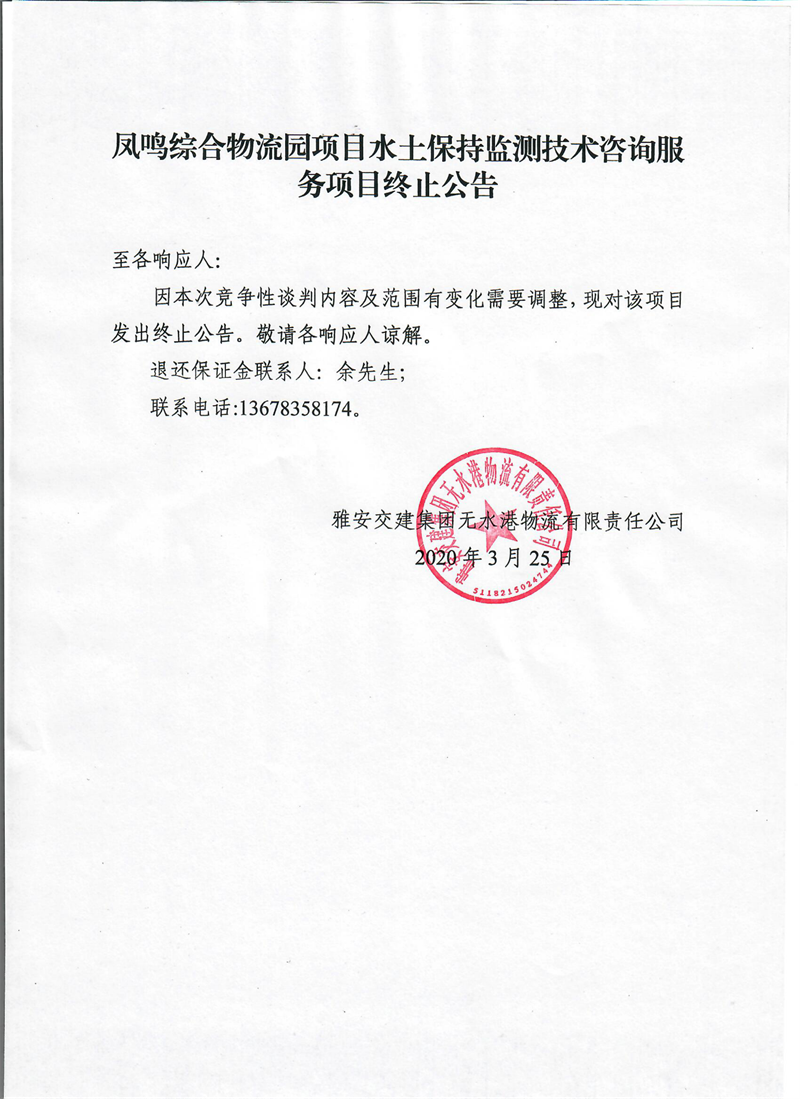 雅安交建集團無水港物流有限責任公司鳳鳴綜合物流園項目水土保持監(jiān)測技術(shù)咨詢服務項目終止公告