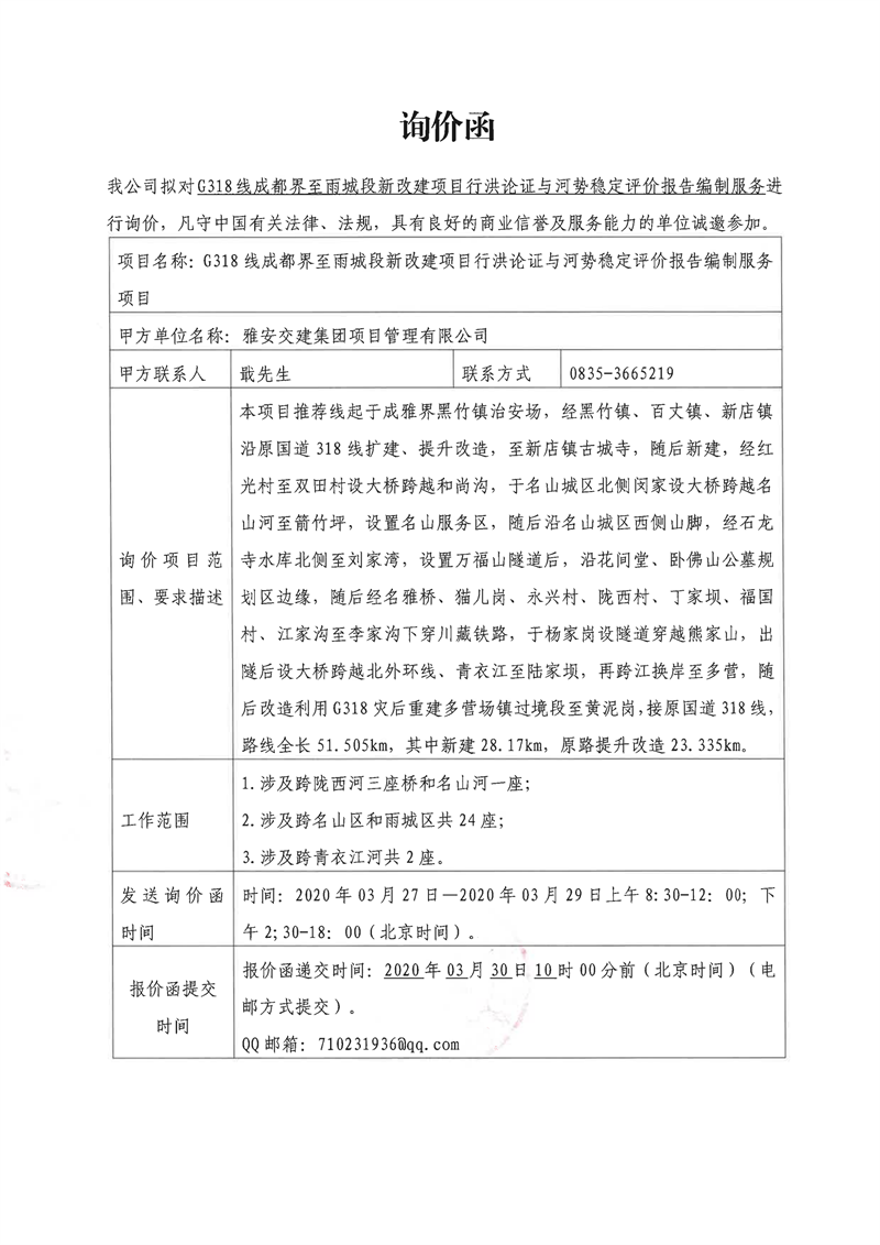 雅安交建集團項目管理有限公司G318線成都界至雨城段新改建項目行洪論證與河勢穩(wěn)定評價報告編制服務項目詢價函