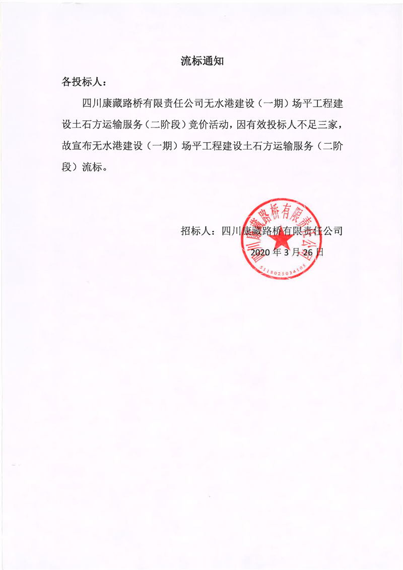 四川康藏路橋有限責任公司無水港建設(shè)(一期)場平工程建設(shè)土石方運輸服務(wù)(二階段)流標通知