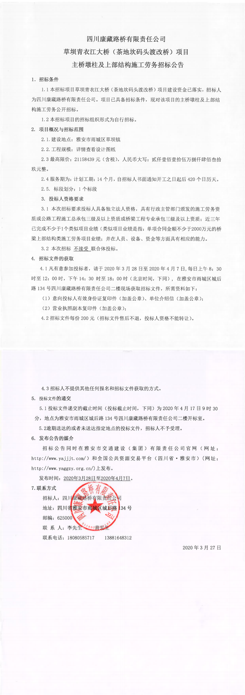 四川康藏路橋有限責任公司草壩青衣江大橋(茶地坎碼頭渡改橋)項目主橋墩柱及上部結(jié)構(gòu)施工勞務(wù)招標公告