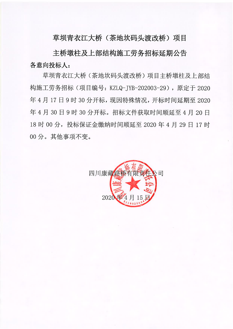 四川康藏路橋有限責任公司草壩青衣江大橋(茶地坎碼頭渡改橋)項目主橋墩柱及上部結(jié)構(gòu)施工勞務招標延期公告