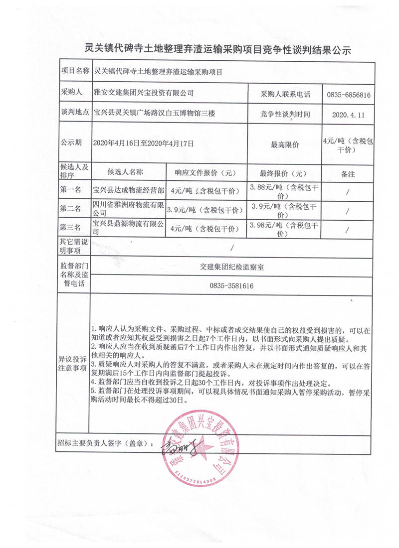 雅安交建集團(tuán)興寶投資有限公司靈關(guān)鎮(zhèn)代碑寺土地整理棄渣運(yùn)輸采購項目競爭性談判結(jié)果公示