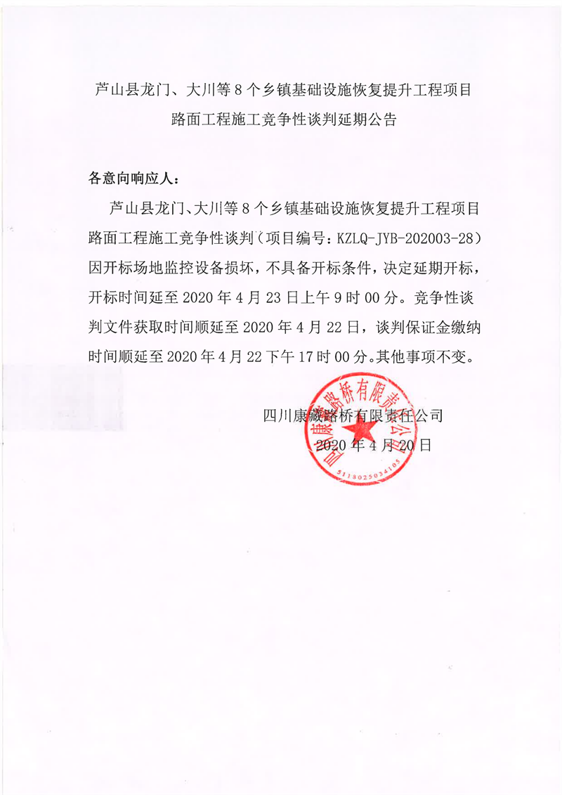 四川康藏路橋有限責任公司蘆山縣龍門、大川等8個鄉(xiāng)鎮(zhèn)基礎設施恢復提升工程項目路面工程施工競爭性談判延期公告